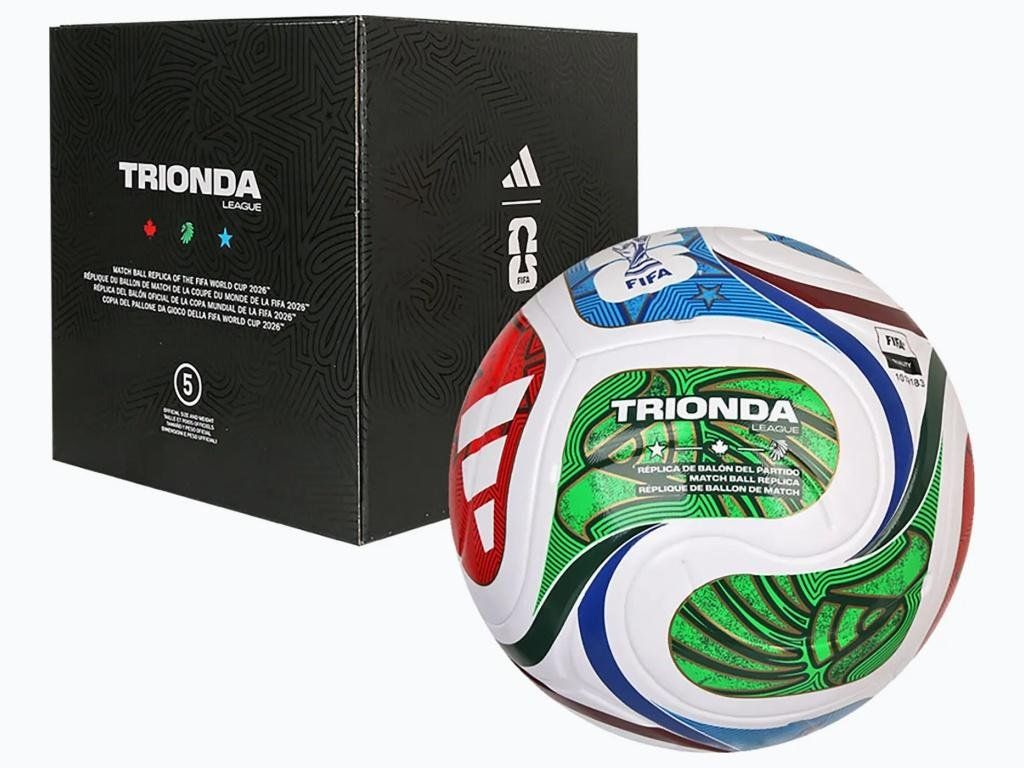 Tréningová lopta adidas League vo veľkosti 5 s dizajnom oficiálnej lopty FIFA World Cup 2026. Bezšvový laminovaný povrch z recyklovaného TPU zabezpečuje stabilný let, presné odskoky a nízky príjem vody. Štruktúrovaný povrch s reliéfnymi vzormi zlepšuje kontrolu lopty aj za mokra. Štvorpanelový dizajn inšpirovaný vlnou „la ola” kombinuje červenú, zelenú a modrú — farby troch hostiteľských krajín šampionátu 2026 (Kanada, Mexiko, USA). Zlaté detaily odkazujú na trofej FIFA World Cup. Lopta je certifikovaná FIFA Quality a hodí sa na tréning aj rekreačnú hru na všetkých typoch povrchov.