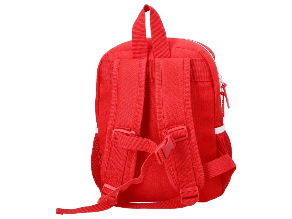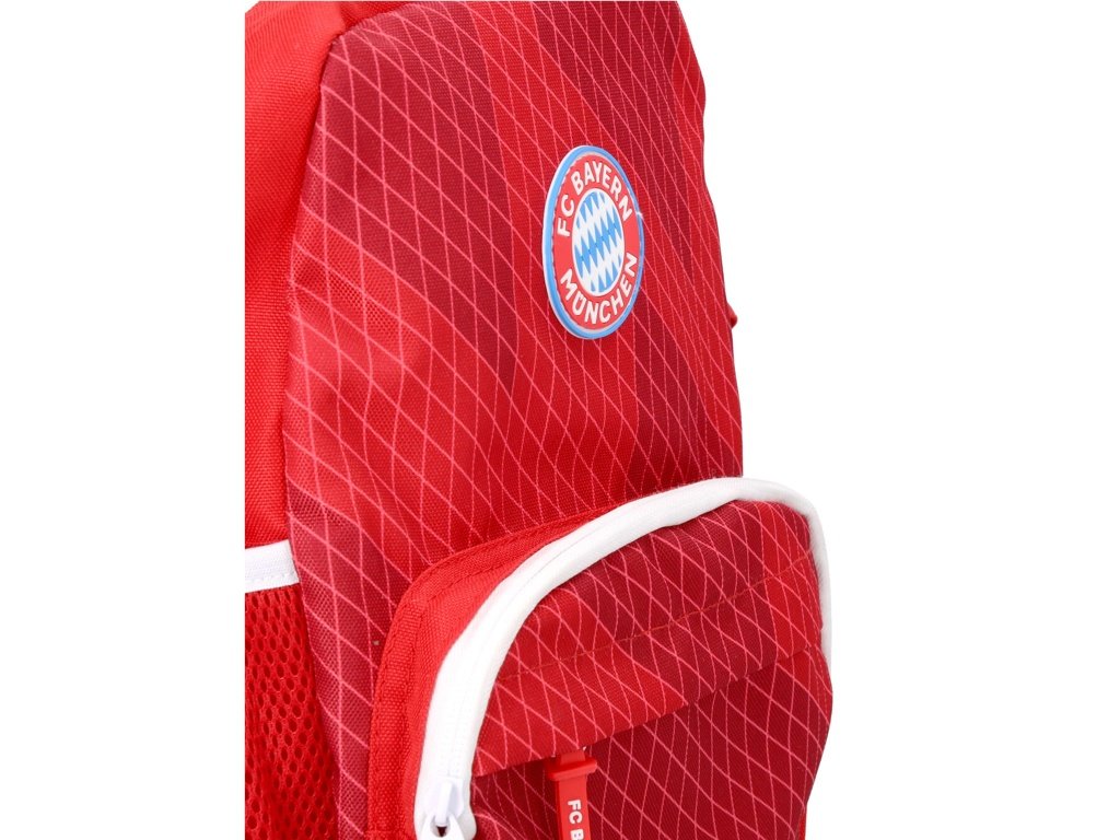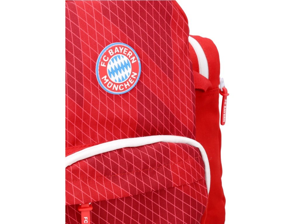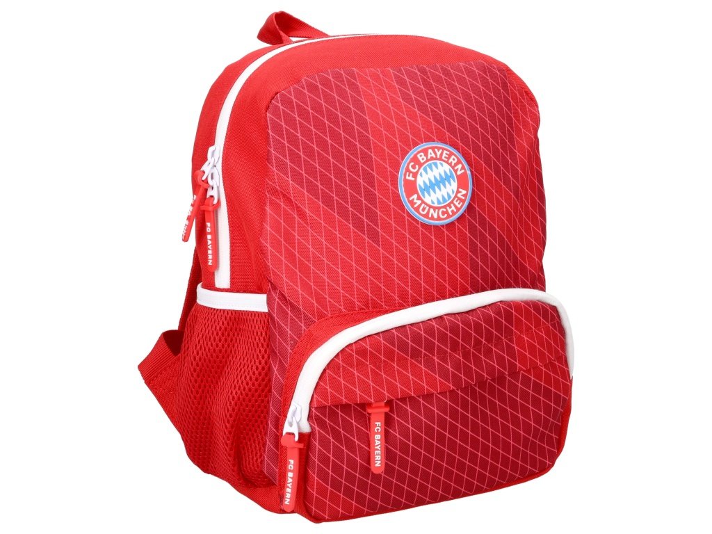 Batoh do škôlky FC Bayern Mníchov v červenej farbe s gumovým znakom na prednej strane. Kompaktný tvar je prehľadný pre malé deti. Povrch je jednoliato červený. Vpredu je gumový znak FC Bayern Mníchov. Výbavu batohu tvorí: Jedna hlavná komora na zips. Predné vrecko na zips. Hlavná komora sa ľahko otvára. Predné vrecko je vhodné na drobnosti a vreckovky. Zipsy sú praktické pre detskú ruku. Rozmer 22 × 27 × 9 cm. Objem cca 5,3 l. Nastaviteľné ramenné popruhy zabezpečia správne usadenie na chrbte. Horné pútko slúži na nosenie v ruke alebo na zavesenie na háčik. Vodoodpudivá úprava chráni obsah pred ľahkým dažďom. Batoh je vyrobený zo 100 % polyesteru. Údržba je jednoduchá, materiál rýchlo schne. Odporúčame utierať vlhkou handričkou. Hodí sa do škôlky, na krúžky aj na výlety.