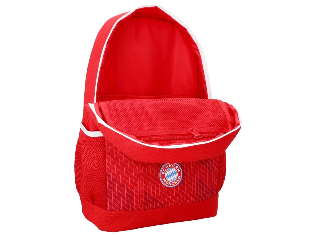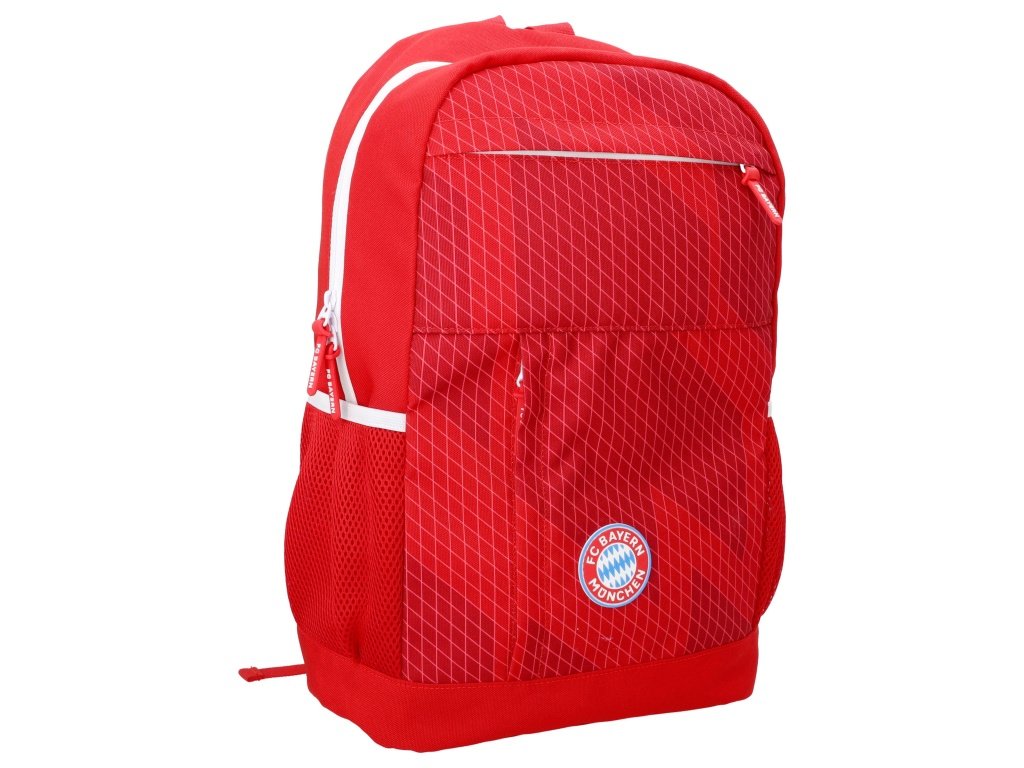 Batoh FC Bayern Mníchov v červenej farbe s vodoodpudivou úpravou a predným znakom klubu. Klubový červený dizajn je výrazný a športový. Prednú časť zdobí znak FC Bayern Mníchov v podobe gumového odznaku. Hlavná komora na zips. Predné vrecko na zips. Hlavný priestor pojme školské zošity aj športové veci. Predné vrecko je vhodné na drobnosti a kľúče. Rozmer 28 × 45 × 14 cm. Objem cca 15 l. Ramenné popruhy sú polstrované a nastaviteľné. Vďaka vodoodpudivej úprave zostanú veci v suchu aj pri ľahkom daždi. Batoh je vyrobený z kvalitného polyesteru. Materiál sa ľahko udržiava. Odporúčame utierať vlhkou handričkou. Hodí sa do školy, do mesta aj na výlety.