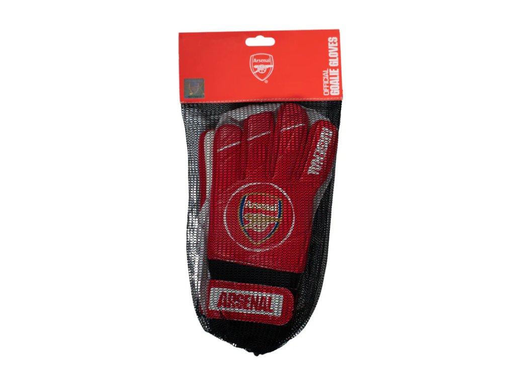 Brankárske rukavice Arsenal FC v červenej farbe. Vyrobené z latexu a polyuretánu. Farebný znak a nápis Arsenal na suchom zipse. Nastaviteľné zápästie. Latexová výplň dlaní. Ľahké vystuženie chrbta. Vek 10-16 rokov. Šírka dlane cca 79 - 86 mm.