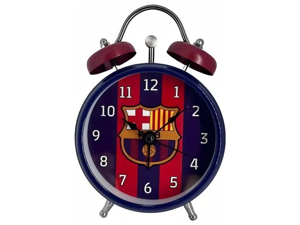 Analógový budík FC Barcelona v retro prevedení s dvoma zvončekmi. Ciferník zdobia zvislé červenomodré pruhy v klubových farbách a veľký znak FC Barcelona uprostred. Biele arabské číslice sú dobre čitateľné aj v šere. Kompaktný priemer 8 cm sa pohodlne zmestí na nočný stolík, poličku alebo pracovný stôl. Kovové nožičky a nosič so zvončekmi dodávajú budíku klasický retro vzhľad.
