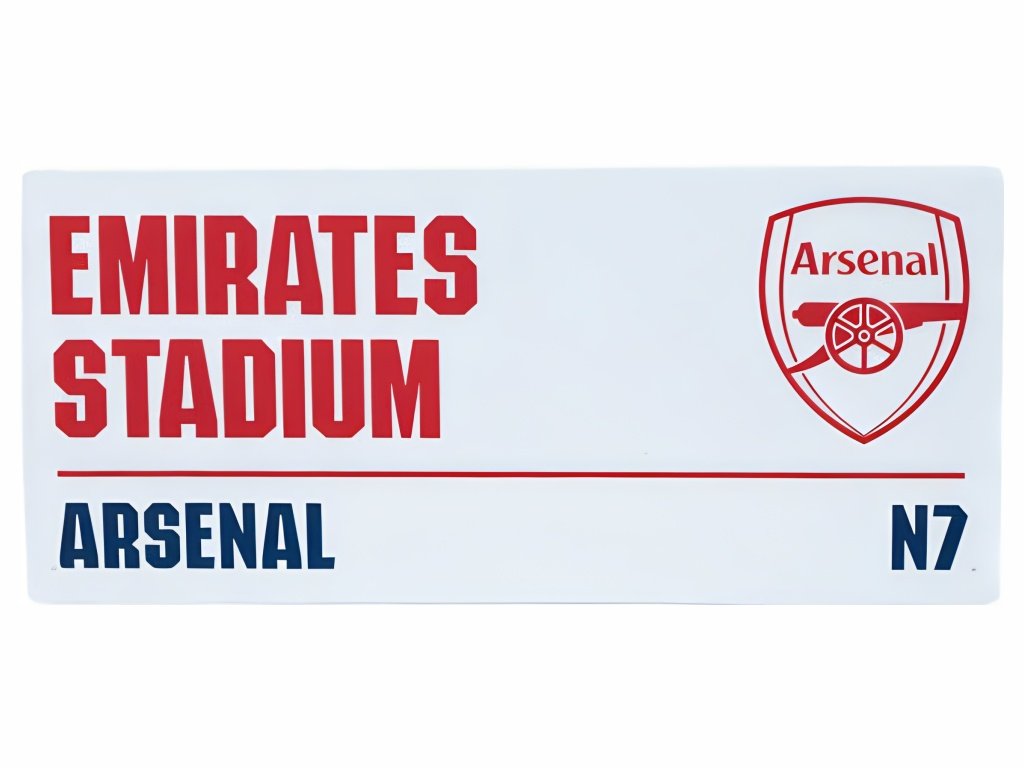 Plechová uličná ceduľa Arsenal FC s motívom Emirates Stadium a označením N7 vynikne na stene izby, pracovne aj garáže. Vyrobená z plechu s bielym podkladom, červeným nápisom „Emirates Stadium“, klubovým znakom a tmavomodrými prvkami „ARSENAL“ a „N7“. Rozmer cca 40 × 18 cm je dobre čitateľný a zároveň neprebije ostatnú výzdobu. Predvŕtané otvory uľahčia zavesenie.