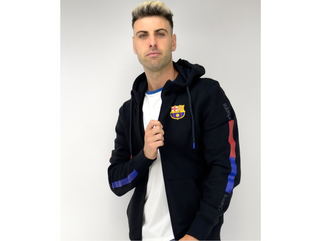 Detská čierna mikina FC Barcelona na zips s kapucňou na každodenné nosenie. Zips uľahčí obliekanie aj vrstvenie. Dve predné vrecká zahrejú ruky a poberú drobnosti. Na hrudi je klubový znak, na rukávoch pruhy vo farbách Barcelony. Rebrované manžety a spodný lem držia tvar. Príjemný materiál zo 60 % bavlny a 40 % polyesteru. Šnúrky pri kapucni majú červené a modré koncovky.
