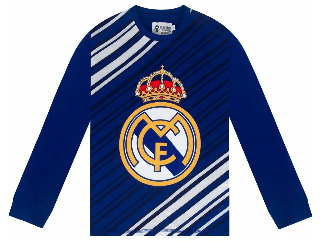 Detské pyžamo Real Madrid v tmavomodrej farbe s dlhým rukávom a nohavicami je pripravené na pokojný spánok malých fanúšikov. Predný diel trička zdobí veľký klubový znak a šikmé pruhy. Tričko má okrúhly výstrih a manžety na rukávoch. Nohavice držia na elastickom páse, pri členkoch majú lemy. Na nohavici je nápis REAL MADRID a menší klubový znak. Príjemná kombinácia bavlny a polyesteru je mäkká na dotyk.