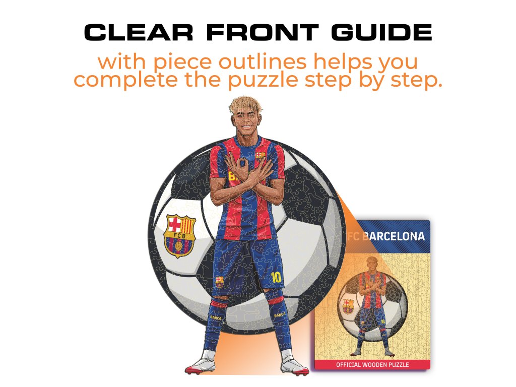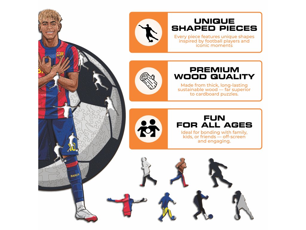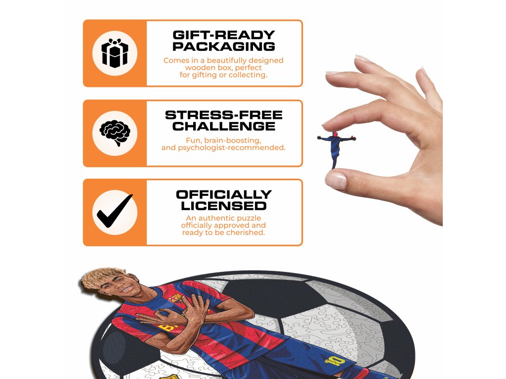 Drevené puzzle Lamine Yamal v drese FC Barcelona. Počet dielikov 150 ks. Rozmer 30 × 21 cm. Precízne spracované puzzle so zobrazením mladej hviezdy Lamine Yamala v drese Barcelony. Hlavný motív dopĺňajú výrazné klubové farby a znak FC Barcelona. Niektoré dieliky majú jedinečný tvar inšpirovaný futbalom. Medzi dielikmi nájdeš siluety hráčov, lôpt a akcií na ihrisku. Puzzle sú vyrobené z masívneho FSC certifikovaného dreva. Dieliky sú až 3× hrubšie než bežné kartónové puzzle. Povrch je hladký a skladanie je príjemné na dotyk. Súčasťou je elegantná drevená darčeková krabička, vhodná aj ako dekoratívny predmet. Puzzle možno nalepiť na podložku a zavesiť na stenu ako originálnu dekoráciu.