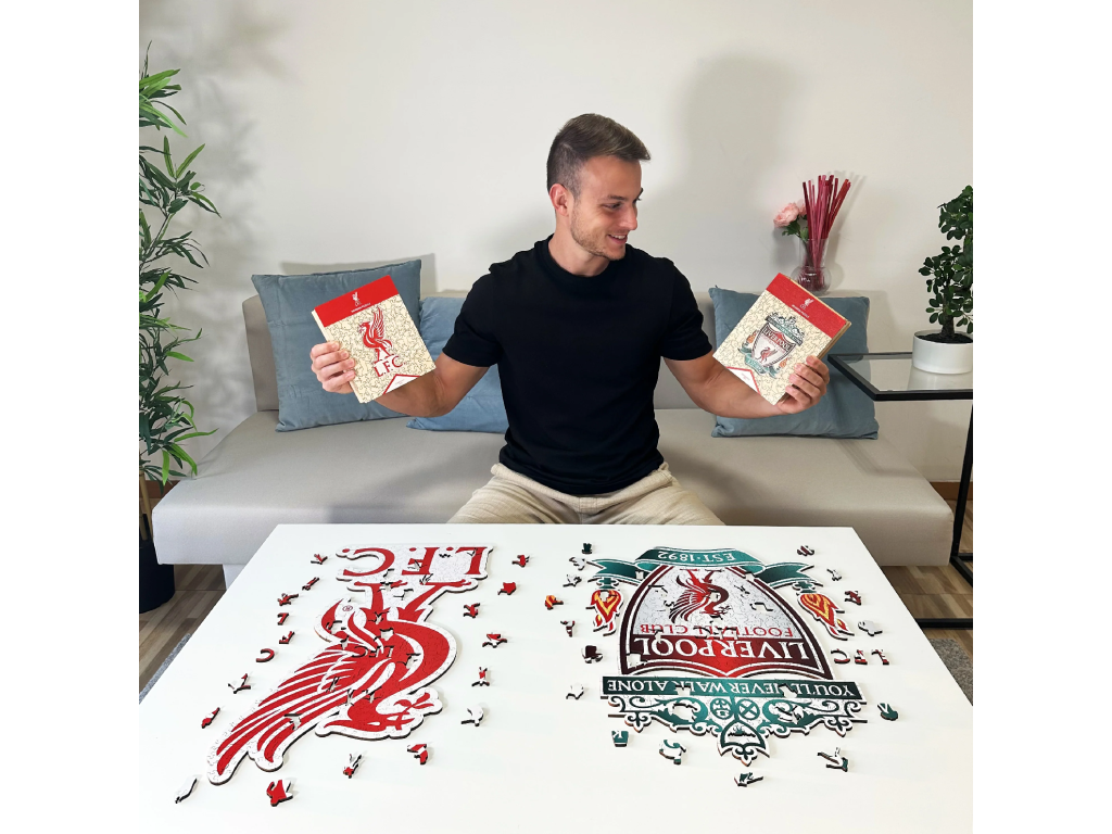 Drevené tvarované puzzle Liverpool FC v tvare ikonického Liver Bird, 500 dielikov. Zložený obraz nemá klasický obdĺžnikový tvar — výsledkom je silueta klubového symbolu s nápisom L.F.C. Puzzle je vyrobené z masívneho FSC certifikovaného dreva o hrúbke 3 mm, teda trikrát silnejšieho než bežné papierové puzzle. Farby sú výrazné a sýtejšie než u kartónových alternatív. Časť dielikov má unikátne tvary inšpirované futbalom — nájdeš medzi nimi siluety hráčov, lôpt i trofejí. Na zloženie počítaj priemerne 7 až 10 hodín.