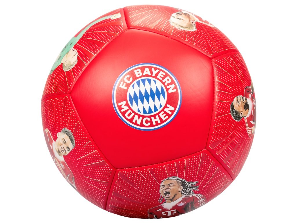 Futbalová lopta FC Bayern Mnichov vo veľkosti 5 na rekreačnú hru. Červený základ dopĺňa lúčovitá bodkovaná potlač a farebné grafiky hráčov sezóny 25-26 v klubových dresoch. Na jednom z panelov je výrazný okrúhly znak FC Bayern. Povrch z TPU je odolný a hladký na dotyk. Panelová konštrukcia dobre drží tvar a lopta sa ľahko udržiava. Na prepravu je dodaný vyfúknutý; pred použitím ho dofúkajte.
