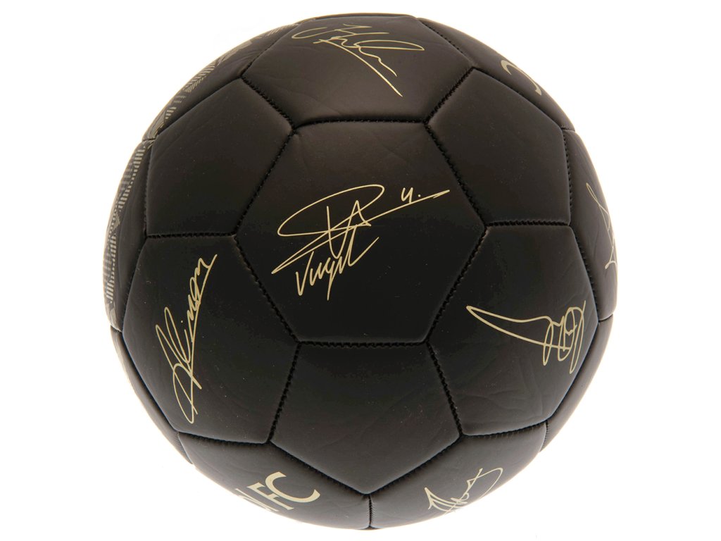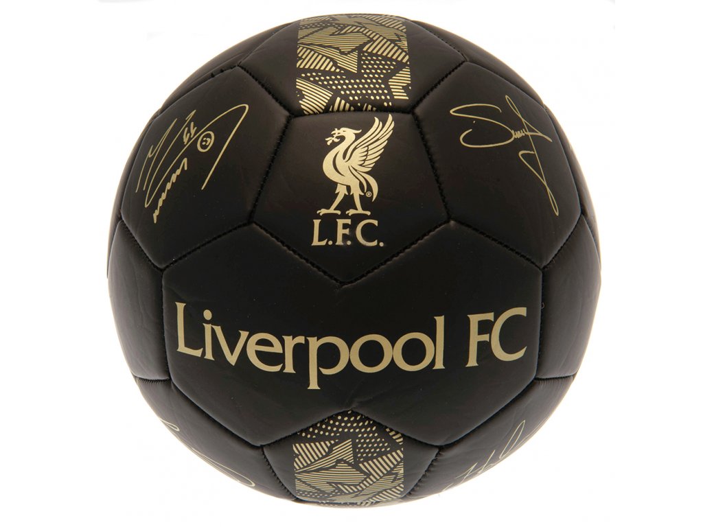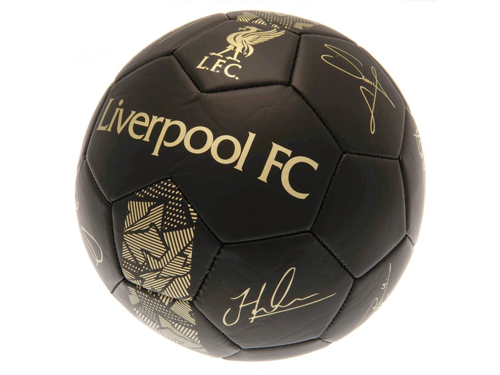 Štýlová futbalová lopta Liverpool FC. Vyniká matne čiernou farbou, zlatým znakom klubu a zlatými odtlačkami podpisov hráčov tohto slávneho klubu. Vyrobený zo syntetickej kože a skladá sa z 32 panelov. Klasická veľkosť č. 5 je vhodná na príležitostnú rekreačnú hru.