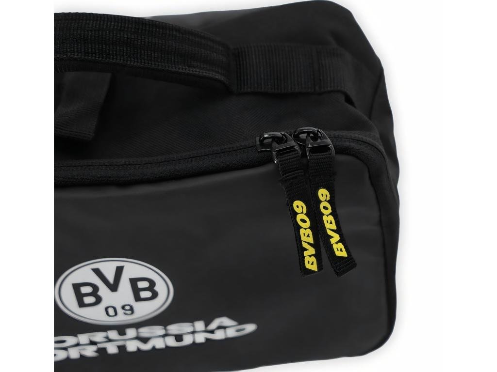 Čierna kozmetická taška Borussia Dortmund s praktickým háčikom na zavesenie a rukoväťou na pohodlné prenášanie. Vo vnútri nájdeš sieťované vrecká na zips, ktoré ti pomôžu prehľadne usporiadať hygienické potreby. Taška je vyrobená zo 100% polyesteru, takže je ľahká a ľahko sa udržiava. Na prednej strane je potlačený znak klubu v striebornosivom prevedení spolu s nápisom Borussia Dortmund. Jazdce zipsov sú opatrené žltým textilom s označením BVB09.