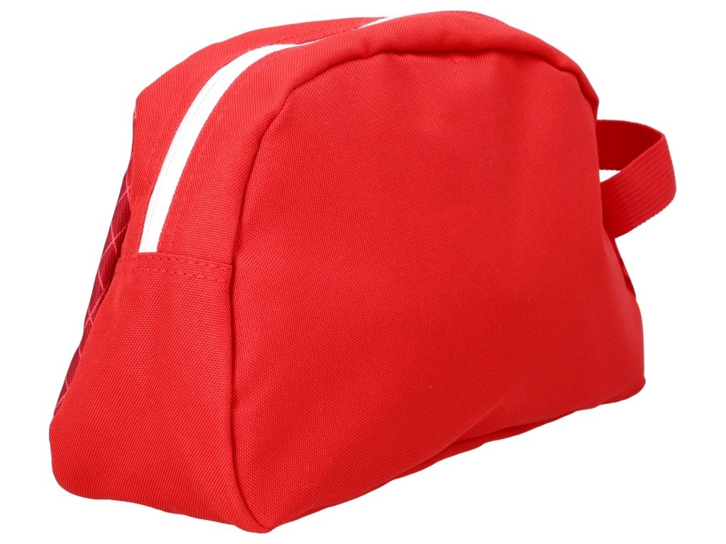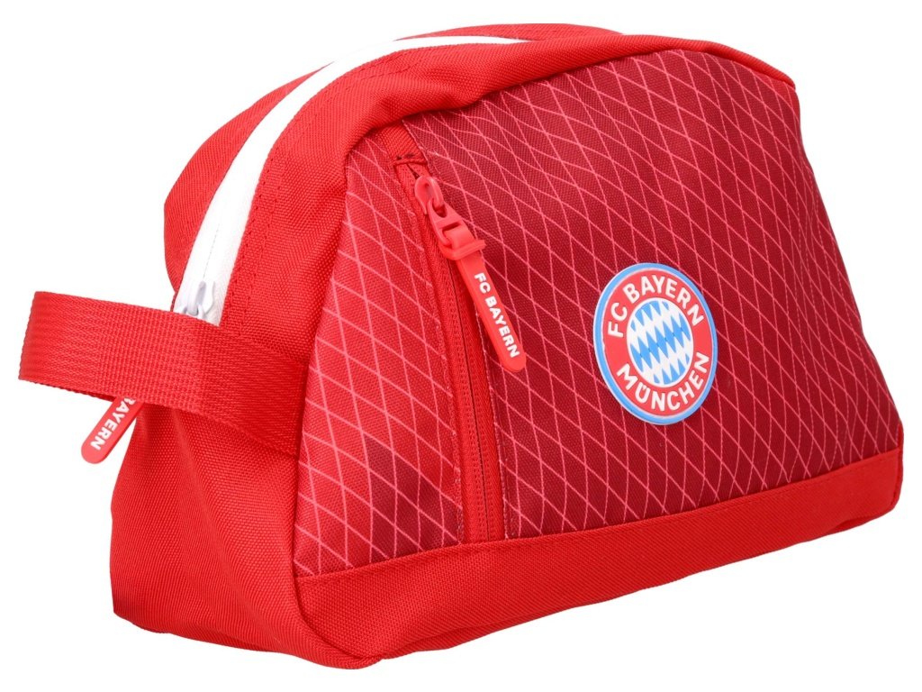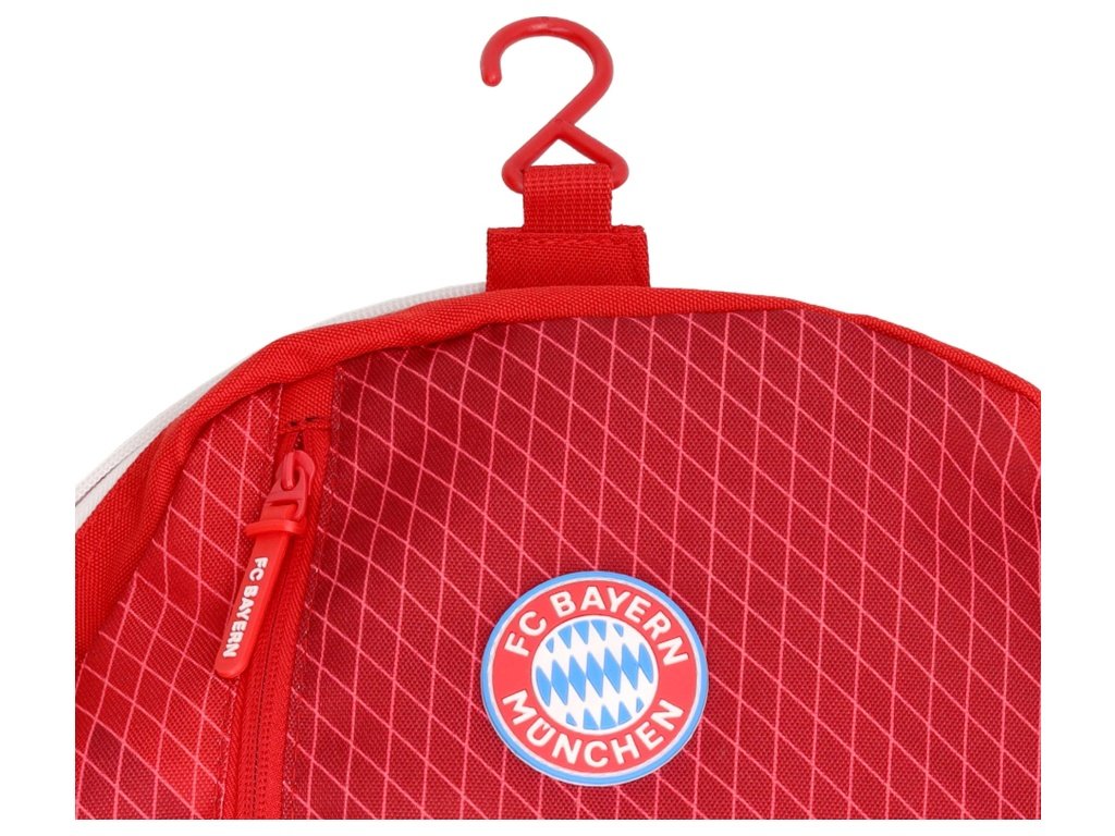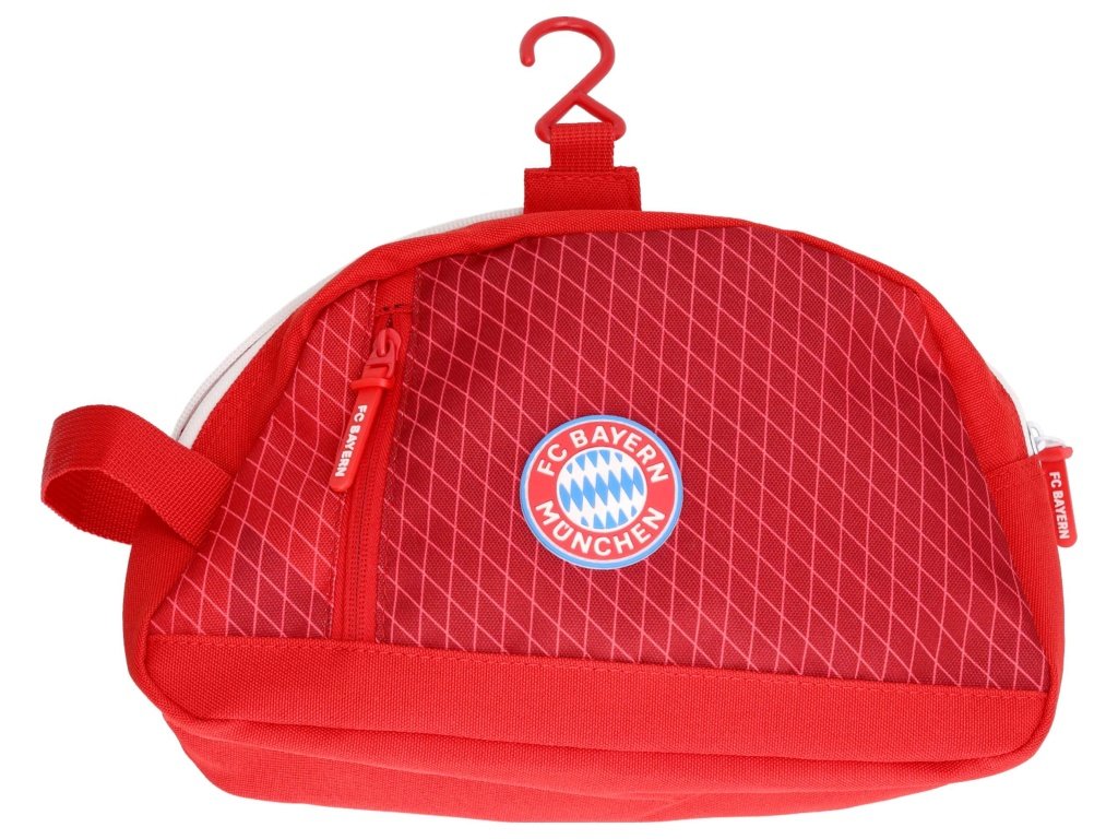 Kozmetická taška FC Bayern Mníchov v červenej farbe s gumovým znakom klubu. Taška má čistý športový vzhľad. Prednú stranu zdobí znak FC Bayern Mníchov v gumovom prevedení. Hlavná komora na zips. Vnútorné vrecká na zips udržia drobnosti prehľadne. Taška chráni obsah vďaka vodoodpudivej úprave. Rozmer 29 × 18 × 11 cm. Objem 2,0 l. Materiál tvorí polyester (100 %). Odporúča sa utierať vlhkou handričkou. Hodí sa do školy, na tréningy aj na cestovanie.