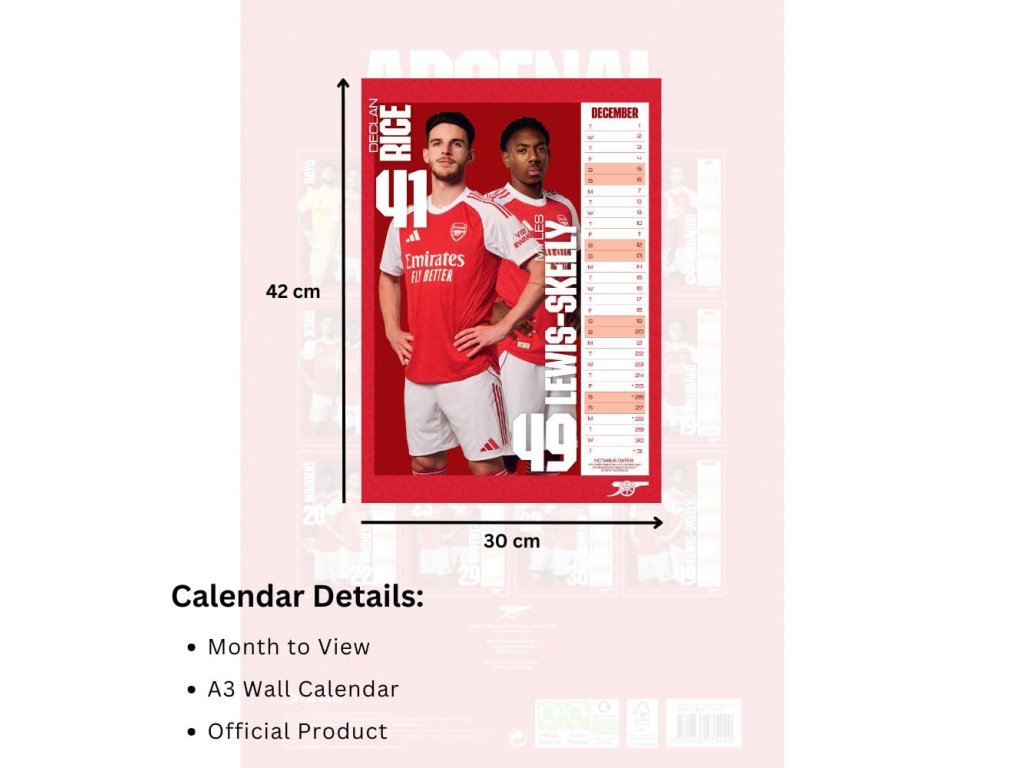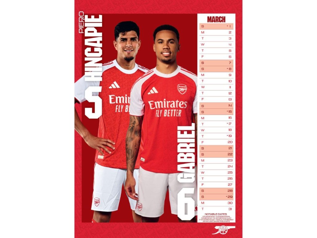Nástenný kalendár Arsenal FC 2026 vo formáte A3 na prehľadné plánovanie doma aj v práci. Každá strana patrí jednému mesiacu s veľkou fotografiou hráčov v klubových farbách. Stĺpcové zobrazenie dní je rýchle na orientáciu a nechá miesto na poznámky. Kvalitná farebná tlač vynikne na stene a podčiarkne atmosféru zápasov. Ideálny tip na darček pre fanúšika Arsenalu.