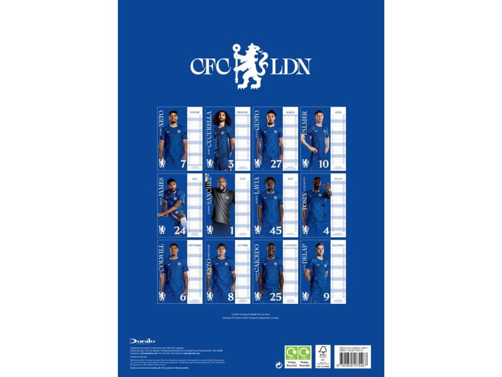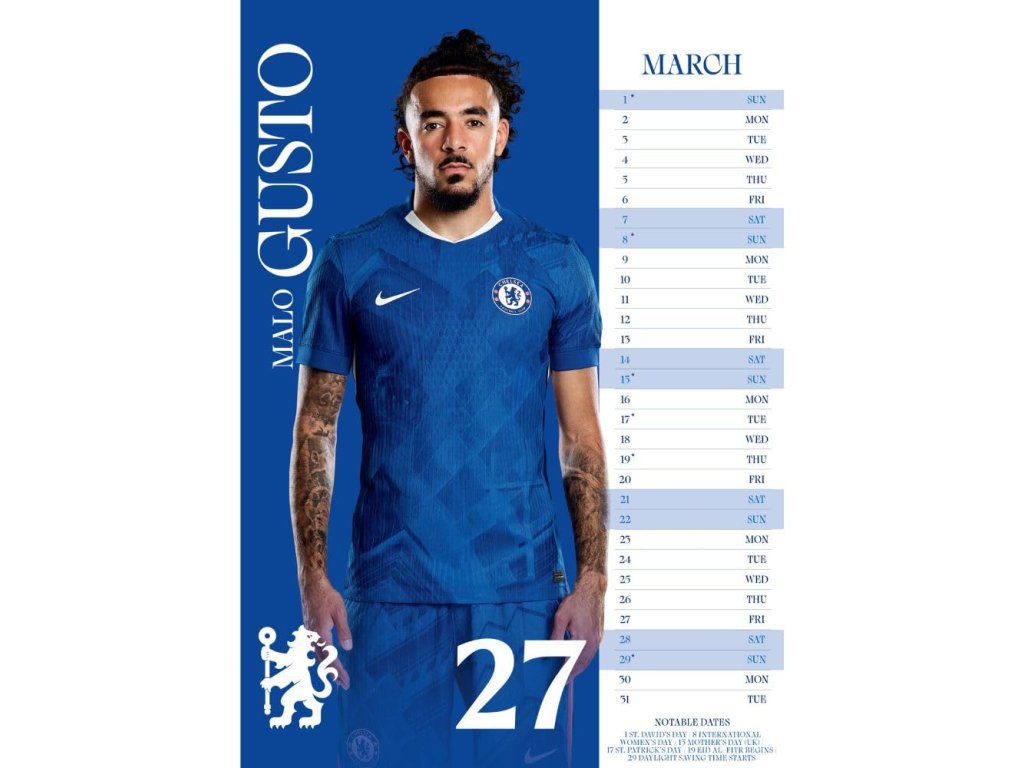 Nástenný kalendár Chelsea FC 2026 v rozmere A3 nadchne každého fanúšika. Veľké klubové fotografie zdobia každý mesiac. Prehľadné mesačné stĺpce majú zvýraznené víkendy pre rýchlu orientáciu. Tlač je v angličtine a dobre čitateľná na stene. Hodí sa domov aj do kancelárie a pomôže plánovať celý rok.