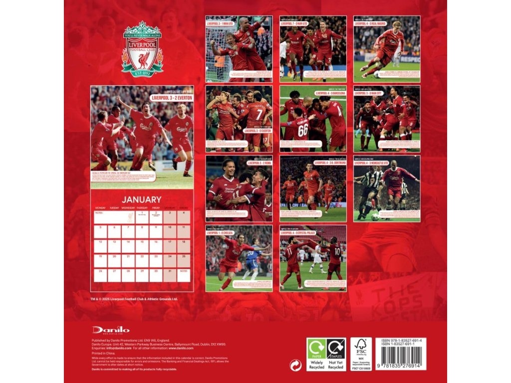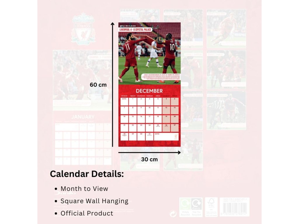Nástenný kalendár Liverpool FC 2026 zachytáva najväčšie zápasy na Anfielde v sýtej klubovej červenej. Štvorcový formát 30 × 30 cm sa hodí na každú stenu. Mesačný prehľad vedie dni pondelok–nedeľa a má vyhradené pole na poznámky. Každý mesiac dopĺňa veľká fotografia zo slávneho stretnutia vrátane výsledku a strelcov (napr. Liverpool 7–0 Man Utd, 5. 3. 2023; Liverpool 4–0 Barcelona, 7. 5. 2019). Na obálke dominuje znak klubu. Farebná tlač poteší fanúšikov aj ako darček.