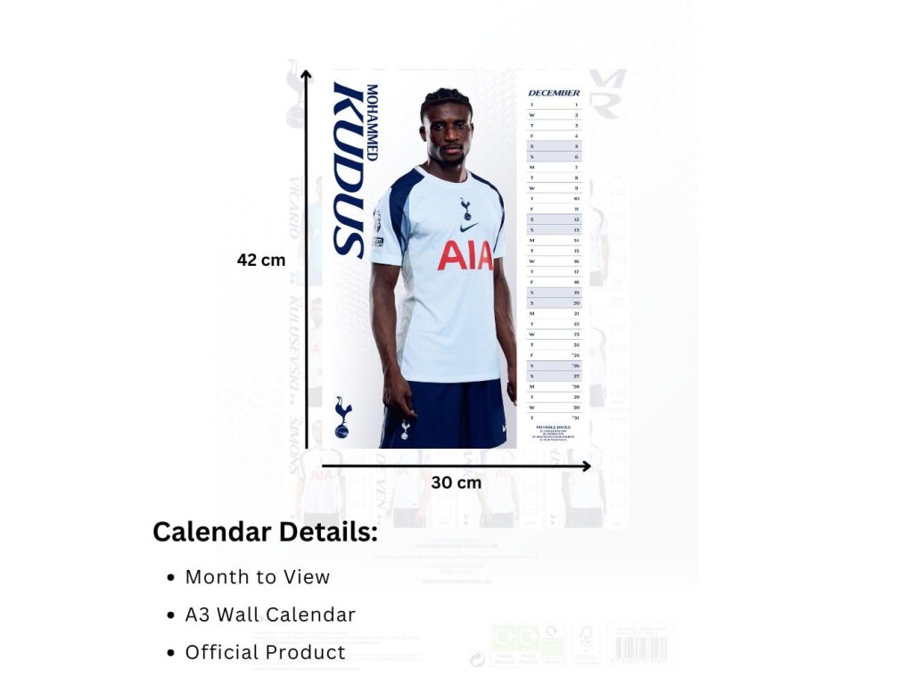 Nástenný kalendár Tottenham Hotspur FC A3 pre rok 2026 je istá voľba pre fanúšikov klubu. Veľké fotografie hráčov dopĺňa prehľadný stĺpec s dňami a dátumami. Mesačné rozvrhnutie uľahčí plánovanie zápasov aj rodinných akcií. Farebná tlač zvýrazní klubové farby a detaily dresov. Anglické názvy mesiacov aj skratky dní.