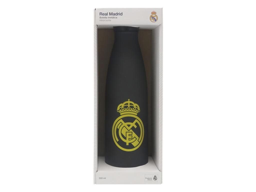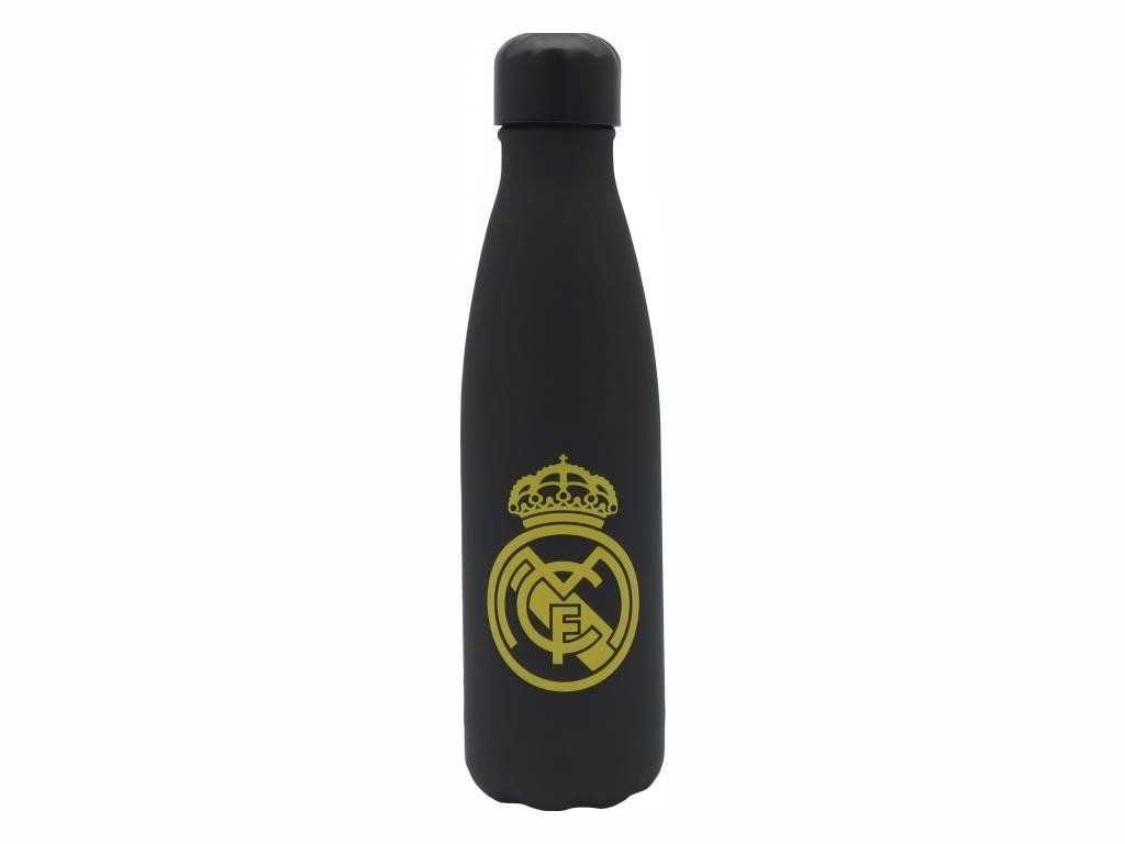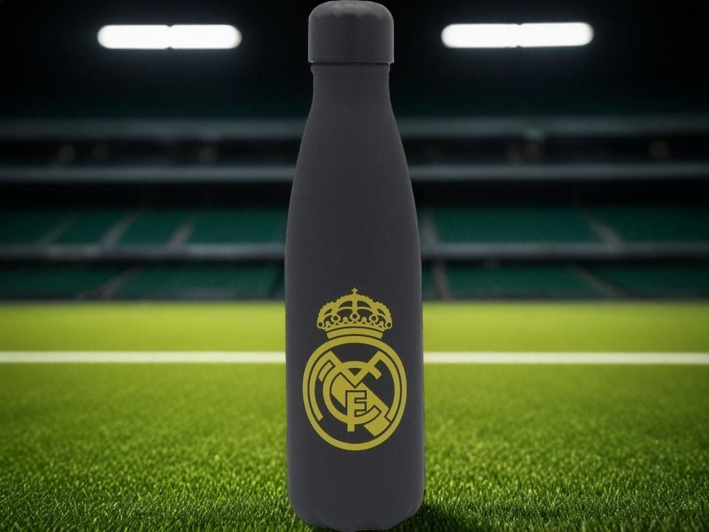 Nerezová termofľaša Real Madrid s pogumovaným povrchom a dvojitou stenou. Objem 500 ml a izolácia z nerezovej ocele udrží teplý nápoj až 12 hodín a studený až 24 hodín. Matný čierny povrch nesie znak klubu na prednej strane a nápis REAL MADRID na zadnej. Skrutkovací uzáver zaistí tesnosť a hrdlo o priemere 34 mm pojme aj kocky ľadu. Pogumovaný povrch príjemne padne do ruky a nekĺže. Potlač je vyhotovená UV technológiou — je hmatateľná a odolná proti oderu.