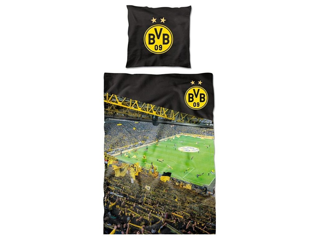 Povlečenie Borussia Dortmund s motívom štadióna. Perinu zdobí pohľad na domáci štadión z fanúšikovskej tribúny. Na vankúši aj perine je výrazný znak klubu. Rozmer periny je 135x200 cm a vankúše 80x80 cm. Vyrobené z príjemného materiálu 100% bavlny, ktorá je príjemná na dotyk a odolná proti opotrebovaniu.