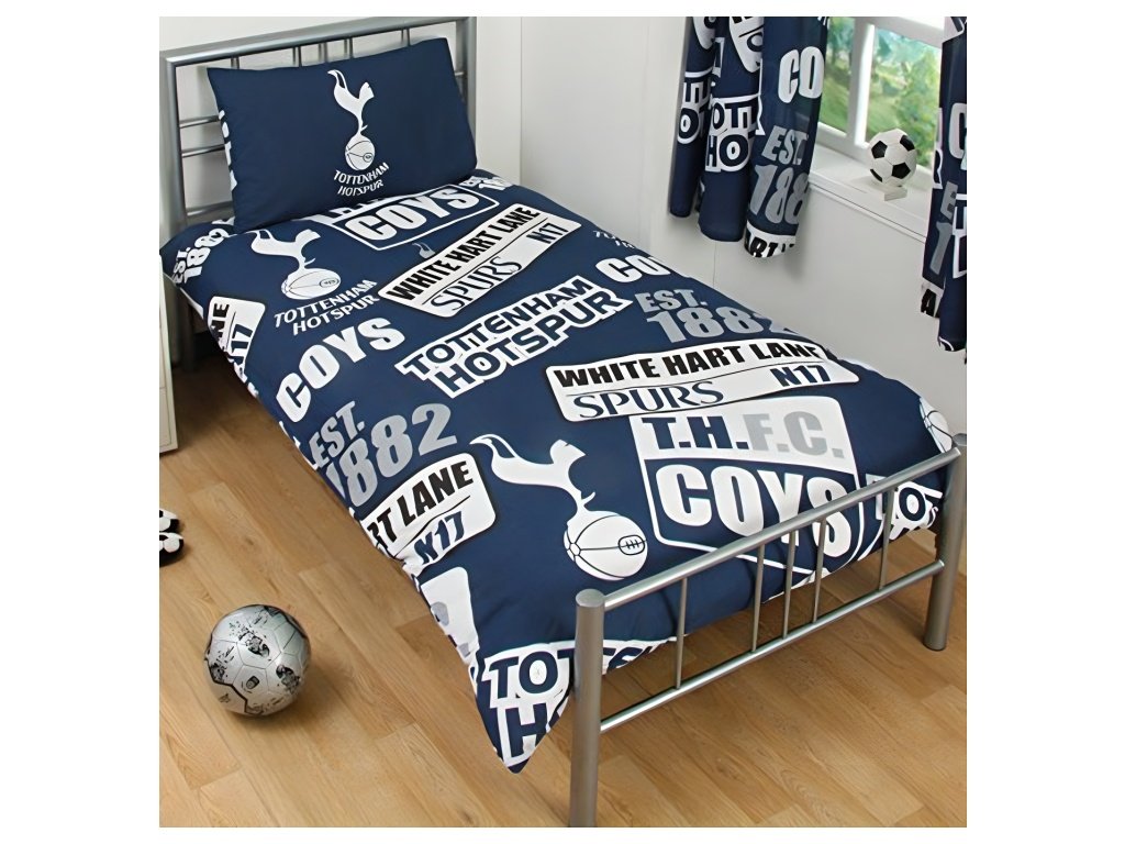 Jednolôžkové obliečky Tottenham Hotspur 135 × 200 cm pre verných fanúšikov Spurs. Tmavomodrý základ dopĺňajú výrazné klubové motívy – znak s kohútom a nápisy COYS, SPURS, THFC, White Hart Lane či EST. 1882. Obliečka na vankúš ladí s prikrývkou a zdobí ju veľký klubový znak. Materiál z poly‑bavlny (70 % polyester, 30 % bavlna) je príjemný na dotyk, rýchlo schne a ľahko sa udržiava.
