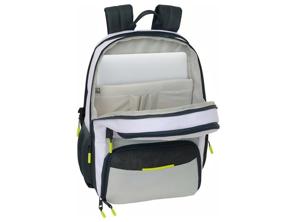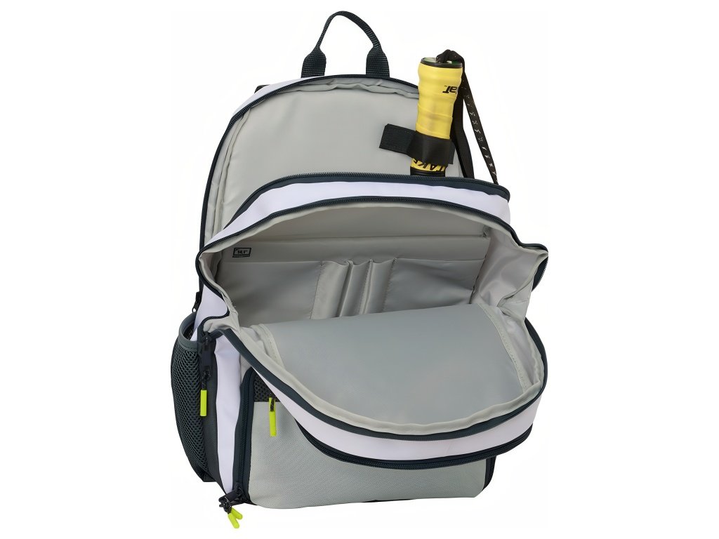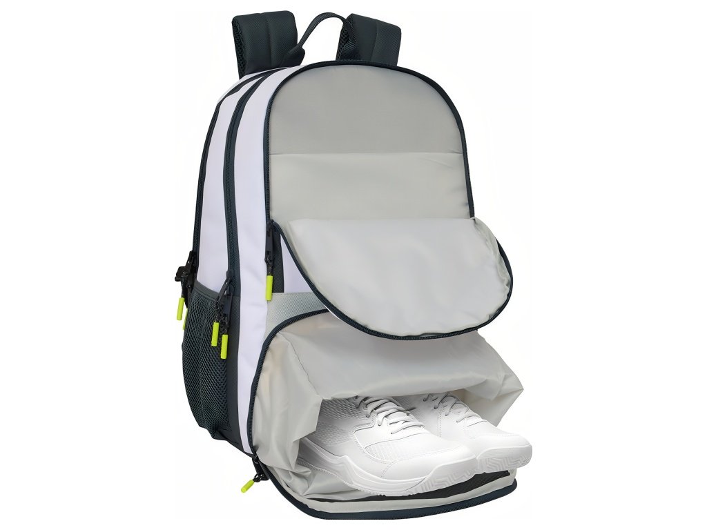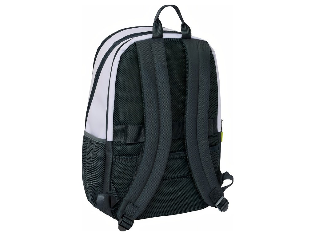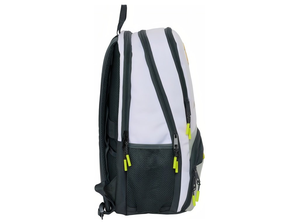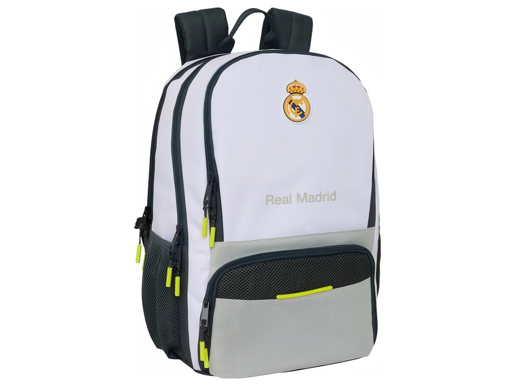 Padelový batoh Real Madrid FC v bielej a svetlosivej s čiernymi prvkami a žltými detailmi na jazdcoch. Predný panel má horné vrecko na zips na doplnky. Jazdce zipsov majú výrazné žlté prvky. Na hornej časti predného panelu je znak Real Madrid FC. Batoh má hlavný priečinok na zips. Vo vnútri je vrecko na notebook 14,1". Zadný priečinok na zips slúži na uloženie padelovej rakety. V spodnej časti je ventilované vrecko na obuv. V hornom prednom vrecku je vnútorný organizér na písacie potreby. Na boku je sieťované vrecko s elastickým lemom na fľašu. Na zadnej strane je vrecko proti krádeži. Hlavné vrecká na zips majú dvojité jazdce. Ťahadlá zipsov sú dlhé pre jednoduchú manipuláciu. Rozmer 30 × 17 × 42 cm. Objem 21,4 l. Ergonomicky tvarované a polstrované ramenné popruhy zvyšujú pohodlie. Chrbát batohu je polstrovaný. Priedušná sieťovina obmedzuje potenie. Vnútro batohu je kompletne podšité a polstrované.