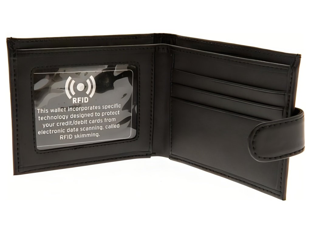 Čierna peňaženka Tottenham Hotspur v klasickom formáte bifold s pásikom na patent a s razeným klubovým znakom. Vo vnútri sú 3 sloty na karty, priehľadné okienko na doklad, dve priehradky na bankovky a jedna ďalšia priehradka. Integrovaná RFID ochrana blokuje nechcené bezkontaktné čítanie kariet. Vyrobené z pravej kože.