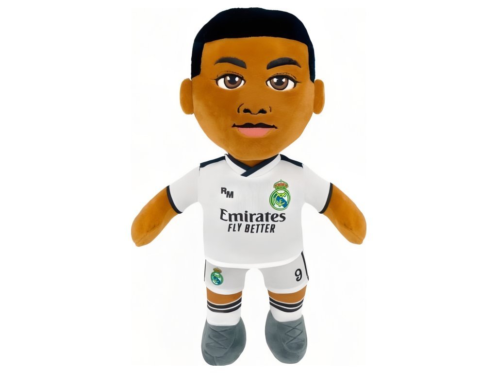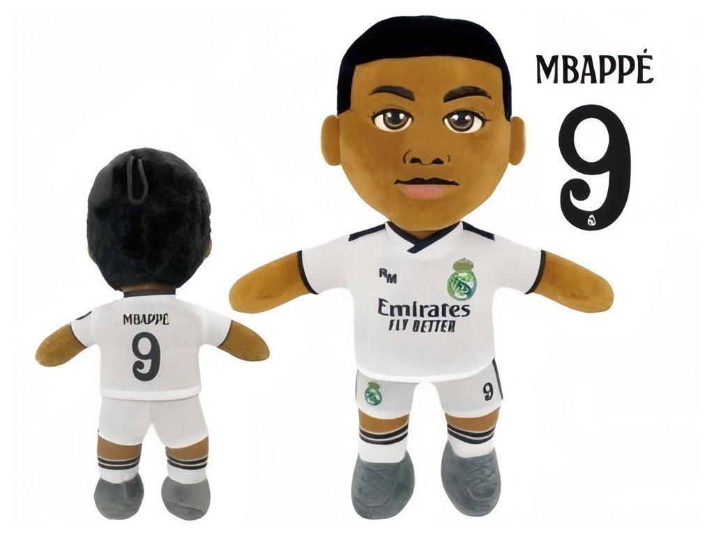 Plyšák Real Madrid FC, Kylian Mbappé v domácom bielom drese. Klubový znak a číslo hráča 9. Na zadnej strane dresu je nápis MBAPPÉ. Plyšák je vyrobený z mäkkého a príjemného materiálu, ideálny na hranie alebo ako dekorácia. Výška 25 cm.