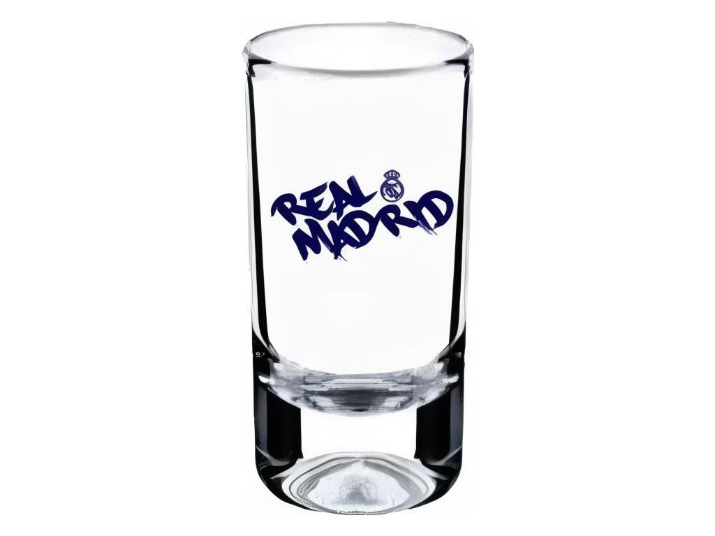 Pohár na panáky Real Madrid s tmavomodrým graffiti nápisom a znakom klubu. Číre sklo s výraznou potlačou REAL MADRID v streetovom štýle, doplnenou klubovým znakom. Objem 60 ml sa hodí na panáky, ochutnávku aj ako dekoratívny kúsok do barovej vitríny. Dodávané v krabičke s okienkom — rovno pripravené ako darček bez ďalšieho balenia.