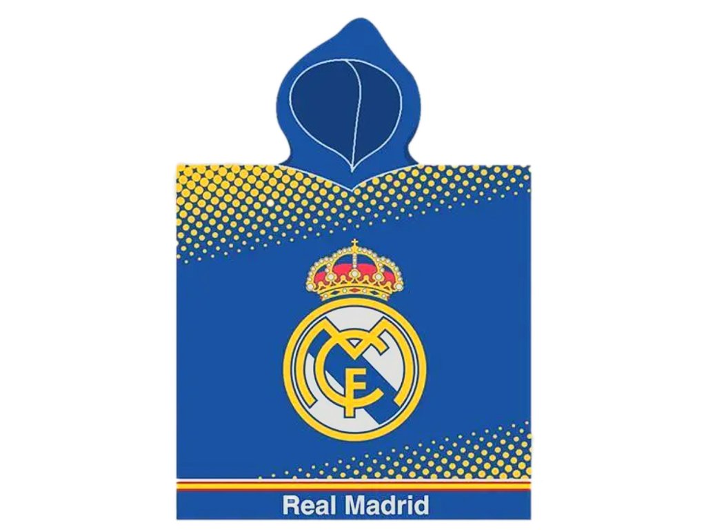 Pončo Real Madrid FC v modrej a zlatej farbe. Na prednej aj zadnej strane dominuje farebný znak slávneho klubu. V spodnej časti zlatý pruh a biely nápis Real Madrid. Kapucňa ochráni pred chladom alebo prípadným nepríjemným vetrom. S rozmerom 55 x 110 cm je vhodným doplnkom na bazén, dovolenku alebo ako náhrada župana. Kvalitná 100% bavlna zaistí príjemnú mäkkosť a savosť.