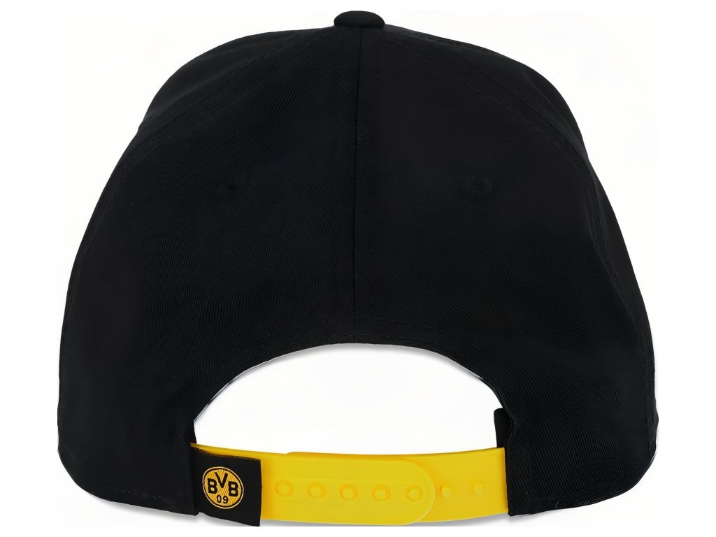 Šiltovka Borussia Dortmund v čiernej farbe s prehnutým šiltom a výraznou výšivkou BORUSSIA. Prednú časť dopĺňa biely nápis DORTMUND BV. a dátum 19. 12. 1909. Plastická výšivka pôsobí kvalitne a odolne. Žltý nastaviteľný snapback zaistí pohodlné usadenie. Na zadnej strane je textilný štítok so znakom BVB 09. Materiál 100 % bavlna je príjemný na každodenné nosenie.