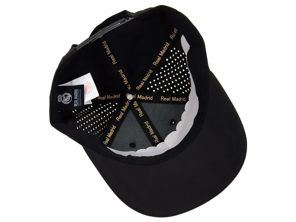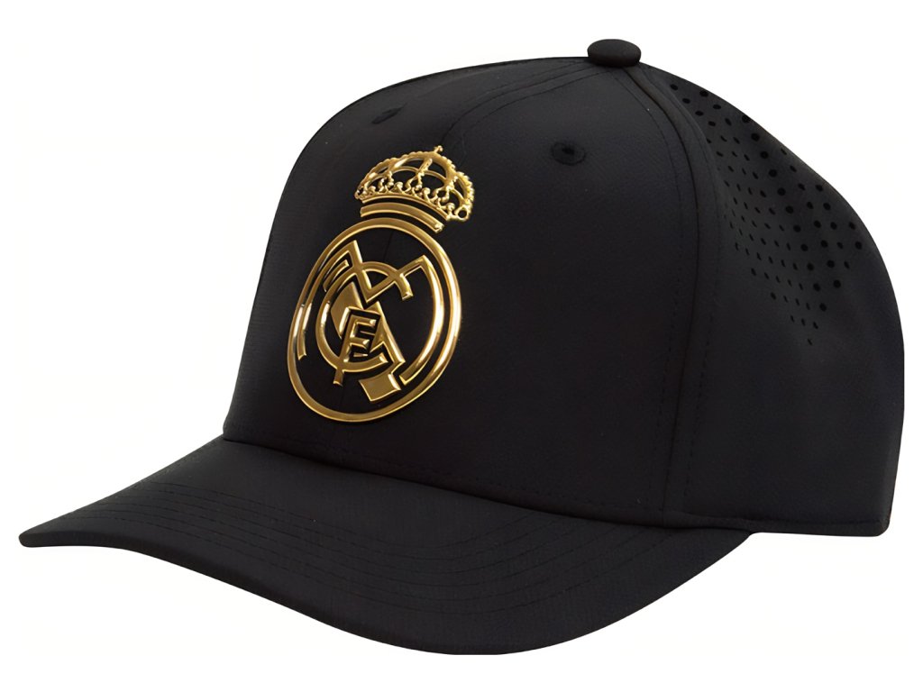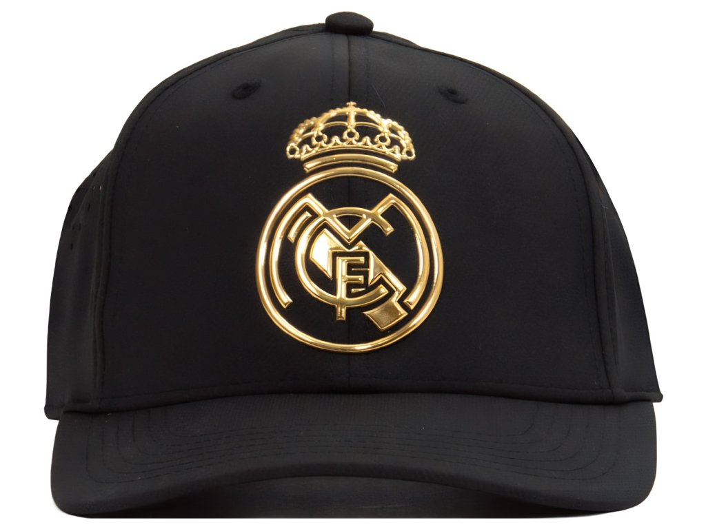 Šiltovka Real Madrid FC v čiernej farbe. Zlatý znak v strede. Kvalitný materiál. Nastaviteľná veľkosť pomocou plastového pásika.
