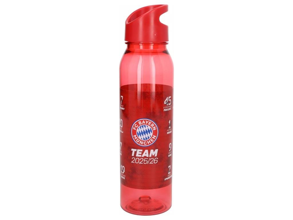 Športová fľaša FC Bayern Mníchov so súpiskou tímu pre sezónu 2025/26. Červená čiastočne priehľadná fľaša z odolného plastu pojme 650 ml. Po celom obvode nájdeš mená a čísla hráčov aktuálneho kádra, uprostred je znak klubu s nápisom TEAM 2025/26. Skrutkovacie viečko s praktickým pútkom uľahčuje prenášanie aj pitie na cestách. Vďaka priehľadnosti fľaše ľahko skontroluj, koľko ti ešte zostáva.
