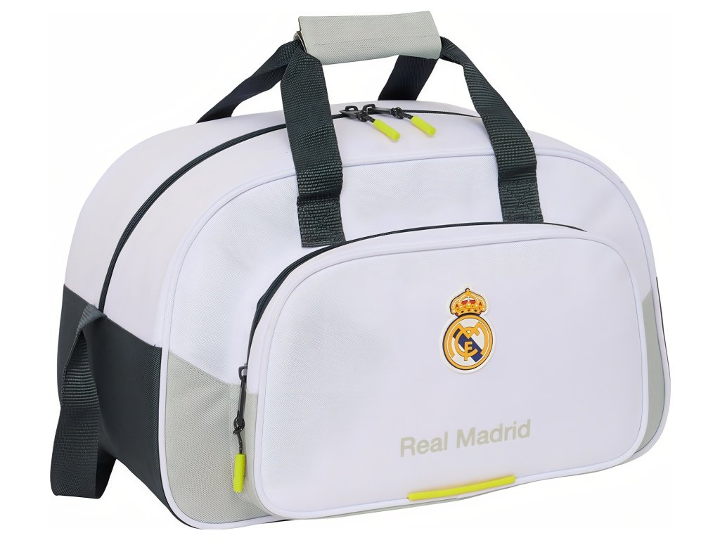 Športová taška Real Madrid v bielo-sivo-čiernom prevedení s predným vreckom a klubovým znakom. Elegantný dizajn kombinuje biely základ so sivými a čiernymi detailmi. Prednú časť zdobí znak Real Madrid FC, ktorý jasne ukazuje, komu fandíš. Taška má priestrannú hlavnú komoru na zips a predné vrecko na zips vhodné na doplnky a drobnosti. Hlavný vstup je vybavený dvojitými jazdcami, ktoré uľahčujú otváranie aj zatváranie. Rozmery sú 40 × 23 × 24 cm a objem činí 22 l. Vďaka nastaviteľnému ramennému popruhu ju môžeš pohodlne nosiť cez plece, zatiaľ čo mäkčené horné madlo je príjemné do ruky. Spodná časť je chránená ochrannými nožičkami, ktoré zabraňujú odieraniu. Vo vnútri sa nachádza vyberateľné polotuhé dno pre lepšiu stabilitu a ochranu obsahu. Taška je vyrobená z odolného polyesteru, ktorý sa ľahko udržiava. Stačí utrieť vlhkou handričkou. Ideálna voľba na tréningy, zápasy aj cestovanie za športom. Svojou veľkosťou sa hodí nielen na futbal, ale aj na ďalšie športy a voľnočasové aktivity.