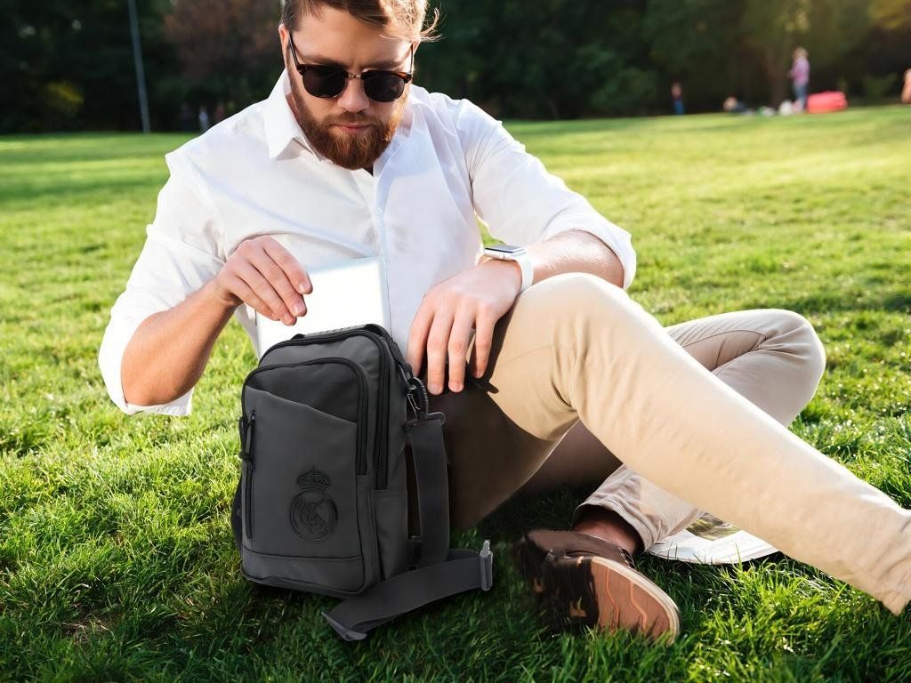 Taška cez rameno Real Madrid z odolného polyesteru v celočiernom prevedení. Kompaktná a praktická — pojme telefón, peňaženku, kľúče i ďalšie drobnosti do troch samostatných vreciek na zips. Nastaviteľný popruh s karabínami si prispôsobíš na mieru a bezpečnostná spona na zadnej strane drží tašku pevne pri tele. Horné ucho s gumovou rukoväťou umožňuje pohodlné prenášanie v ruke. Prednú stranu zdobí pogumovaný reliéfny znak Real Madrid v čiernom prevedení, ktorý dodáva taške elegantný a decentný vzhľad.