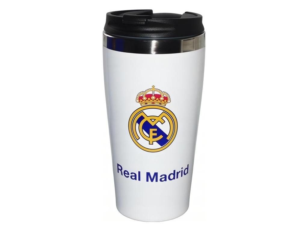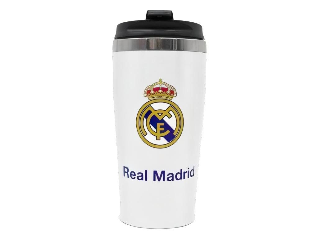 Nerezový termohrnček Real Madrid s dvojitou stenou a uzatvárateľným náustkom. Cestovný termohrnček z nerezovej ocele s objemom 450 ml spoľahlivo udrží tvoj nápoj teplý aj studený. Skrutkovacie viečko so silikónovým tesnením minimalizuje riziko vyliania. Náustok na pitie je krytý vo viečku — jedným pohybom ho otvoríš a po napití zase zavrieš. Na bielom tele hrnčeka je potlačený znak klubu a tmavomodrý nápis Real Madrid.