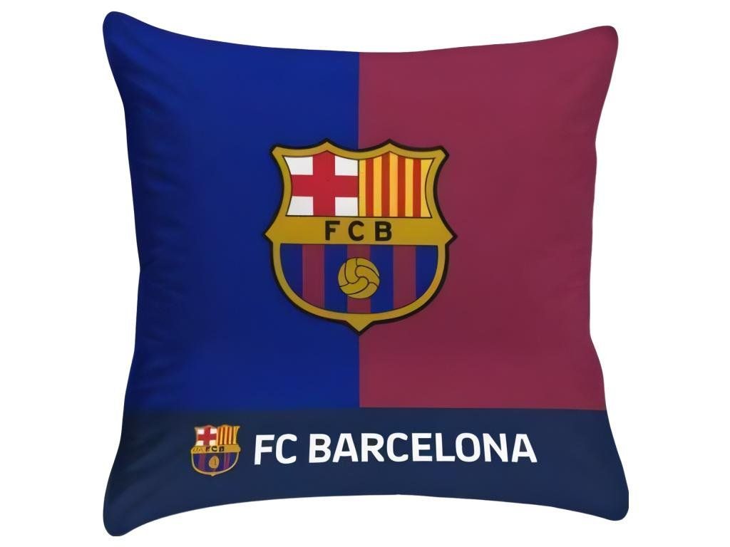Dekoračný vankúšik FC Barcelona v klubových modro-vínových farbách s výplňou. Štvorcový formát 35 × 35 cm sa hodí na pohovku, posteľ aj do detskej izby. Predná aj zadná strana nesú rovnaký dizajn — veľký znak klubu v strede a nápis FC BARCELONA v spodnom tmavomodrom pruhu. Poťah zo 100% polyesteru je príjemný na dotyk a ľahko sa udržiava. Výplň je pevne všitá, vankúšik nemá zips.