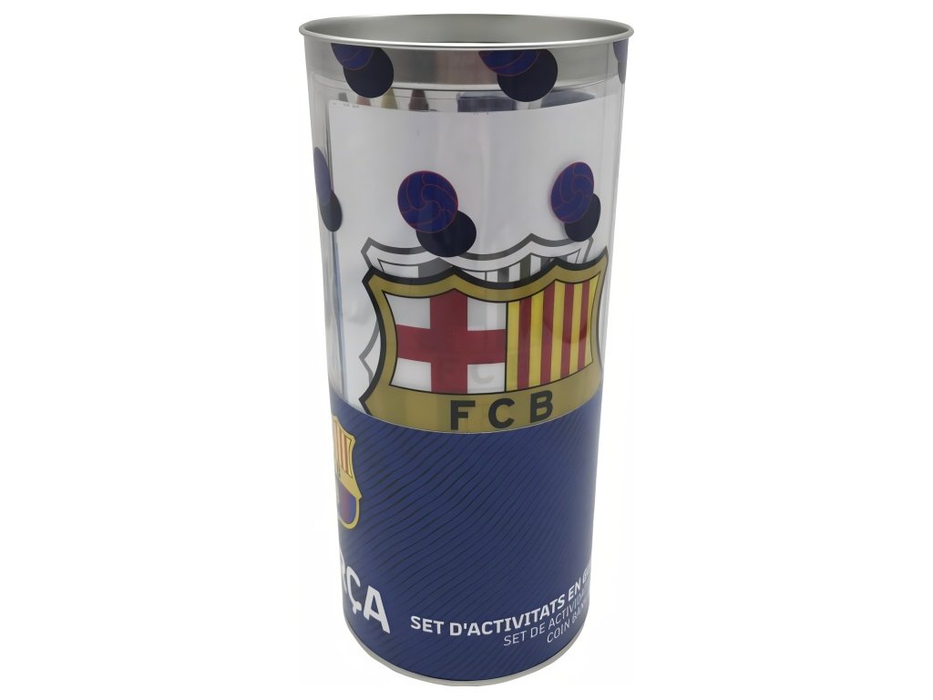 Výtvarný set FC Barcelona s 38 dielmi v plechovom tubuse, ktorý po vybalení poslúži ako pokladnička. Obsahuje pastelky, voskovky, vodové farby, štetec, pečiatku, strúhadlo, gumu, šablóny, listy na kreslenie aj samolepky — všetko v klubových farbách a s motívmi Barçy. Kompletná výbava pre malých výtvarníkov, ktorí milujú futbal. Tubus má hore otvor na mince, takže po vybalení získa dieťa aj praktickú pokladničku so znakom klubu.