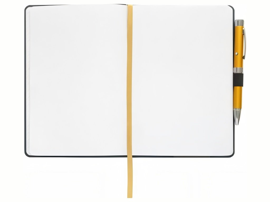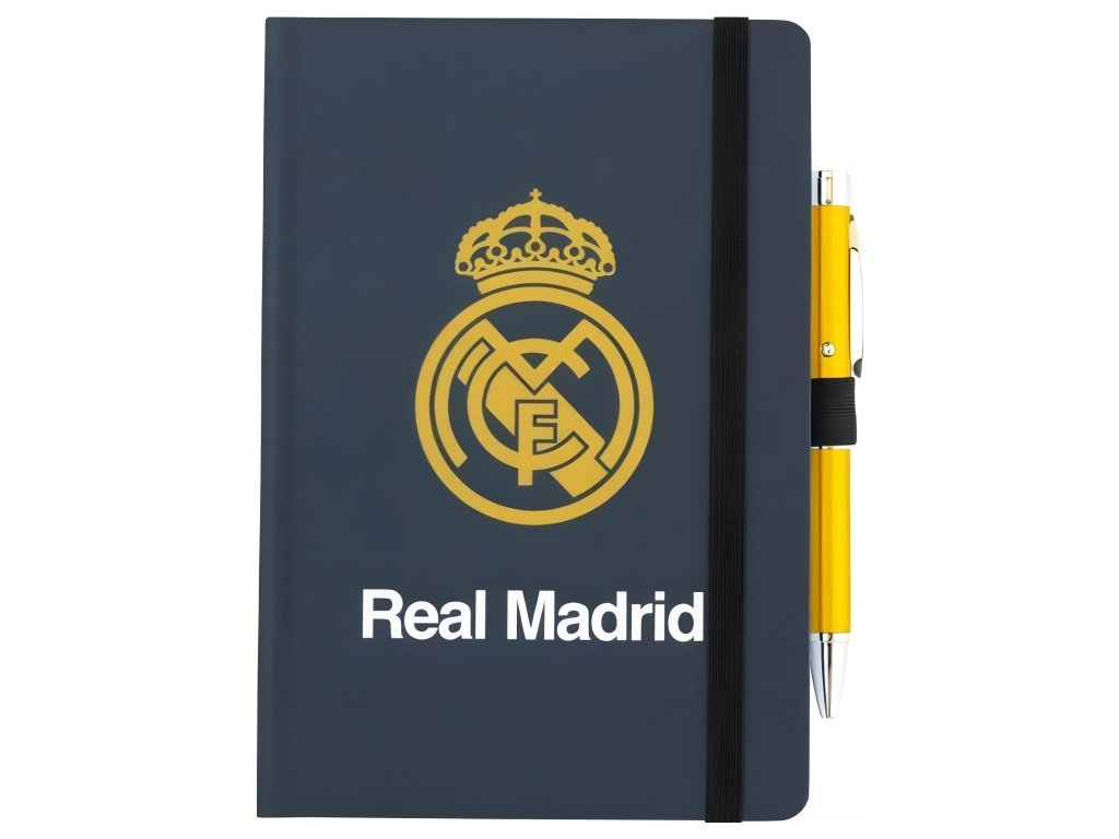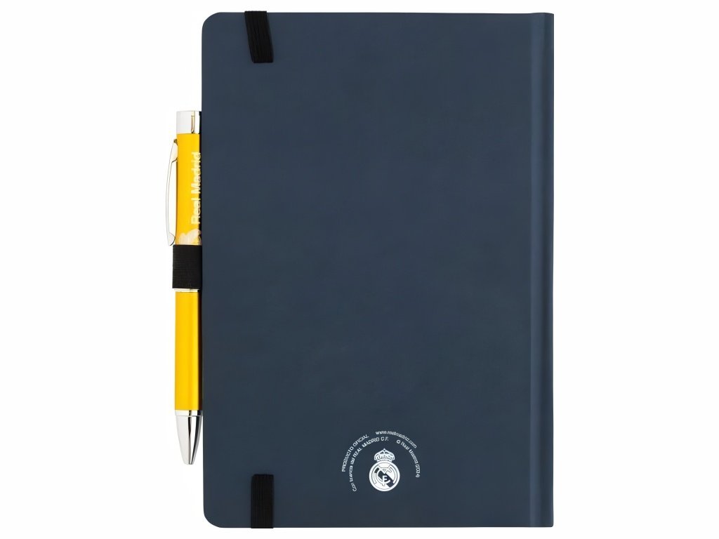 Zápisník Real Madrid FC v modrej farbe. Vyrazený znak slávneho klubu. Čierna gumička zabezpečujúca praktické zatváranie. Rozmer A5. Celkovo 96 strán. Súčasťou sady je aj žlté pero s modrým atramentom.