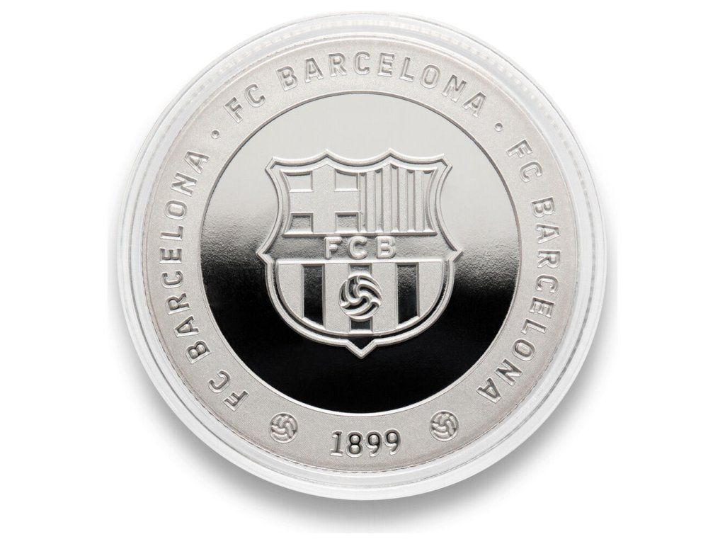 Zberateľská minca FC Barcelona s klubovým heslom Més que un club so striebornou povrchovou úpravou. Minca zo zinkovej zliatiny (zamak) je reliéfne razená z oboch strán a vyniká precíznym spracovaním detailov. Na prednej strane nájdeš detailne prepracovaný znak klubu, na zadnej strane ikonické heslo Més que un club. Obe strany lemuje nápis FC Barcelona a rok založenia 1899. Minca je chránená v priehľadnej akrylovej kapsli.