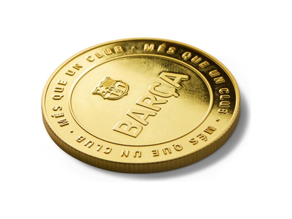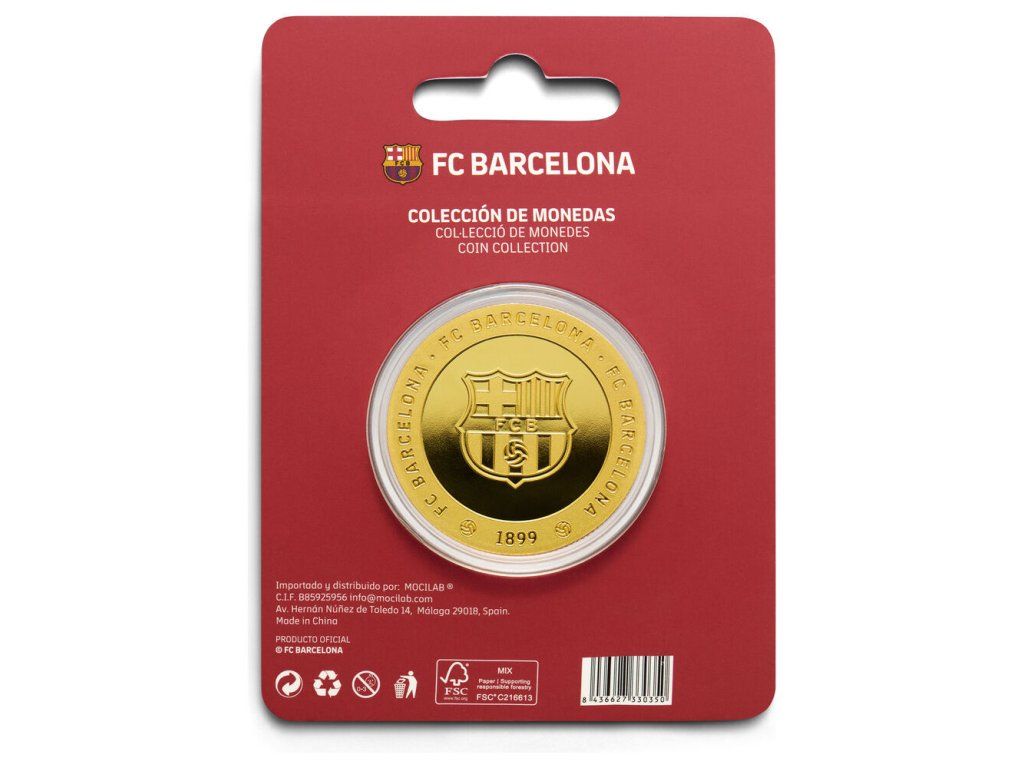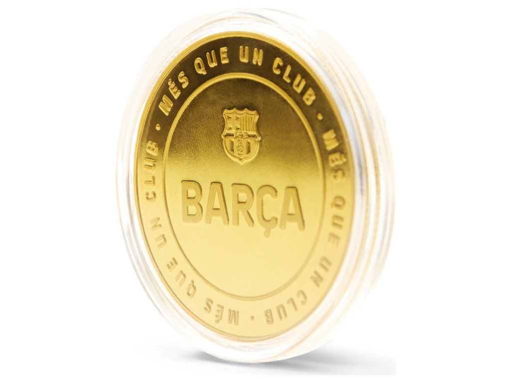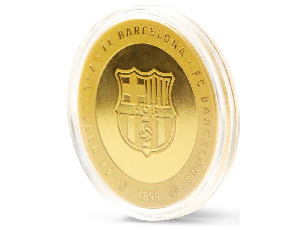 Zberateľská minca FC Barcelona s reliéfnou razbou z oboch strán a zlatou povrchovou úpravou. Minca je vyrobená zo zinkovej zliatiny (zamak) a dodávaná v priehľadnej akrylovej kapsli, ktorá ju chráni pred poškriabaním a odtlačkami prstov. Na prednej strane dominuje reliéfny nápis BARÇA so znakom klubu, po obvode obopína mincu legendárne motto Més Que Un Club. Zadná strana nesie veľký znak FC Barcelona s nápisom FC BARCELONA po obvode a letopočtom založenia klubu 1899. Vrúbkovaná hrana dodáva minci autentický mincový vzhľad.