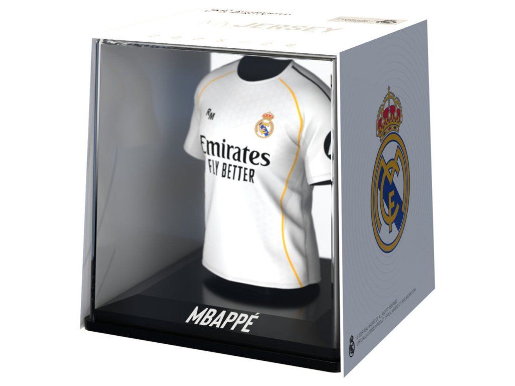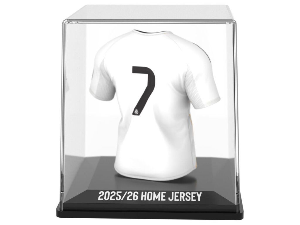Zberateľský mini dres Real Madrid v domácom prevedení sezóny 2025/26 s priehľadnou vitrínou. Detailná replika ikonického bieleho dresu so zlatými lemovacími líniami, čiernym golierom a číslom 7 na chrbte. Vitrína z akrylátu s čiernym podstavcom chráni dres a zároveň ho efektne vystavuje. Mini dres je vyrobený z vinylu a biodegradabilného plastu, takže spája kvalitné spracovanie s ohľadom na životné prostredie. Súčasťou je NFC čip na overenie pravosti a prístup k rozšírenej realite — stačí priložiť telefón.